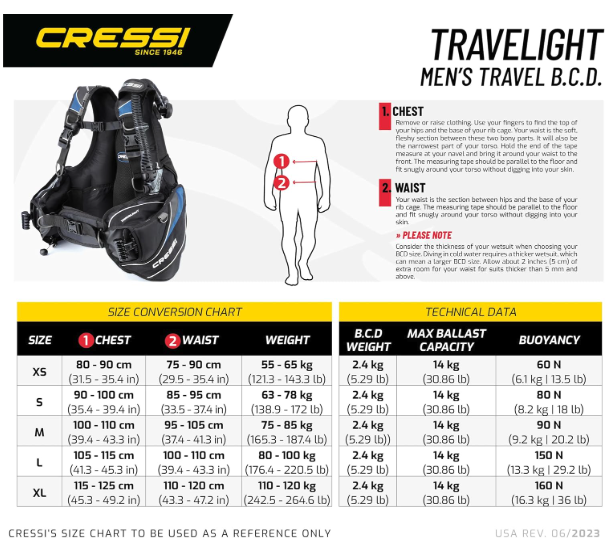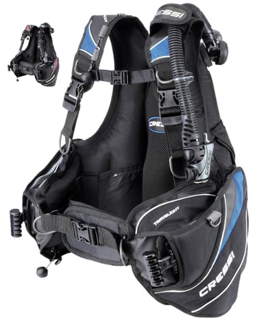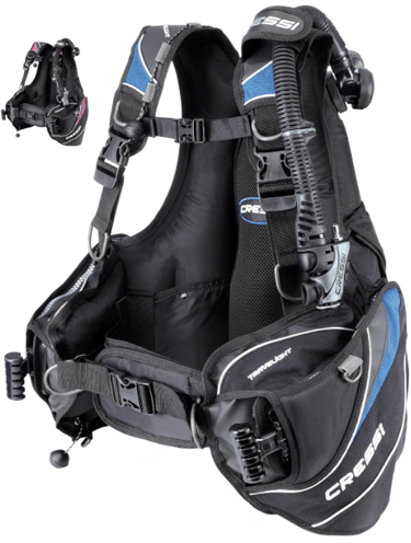 The Cressi Travelight BCD is only 2.5kg (Jacket) with integrated weights. Sizes from X-small to X-Large. Best choice for novice divers. This BCD is great for both Men and women alike.